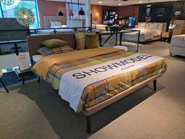 Fraai en eigentijds ledikant met 2 robuuste spiralen als bodem gestoffeerd in een heerlijk zachte stof.